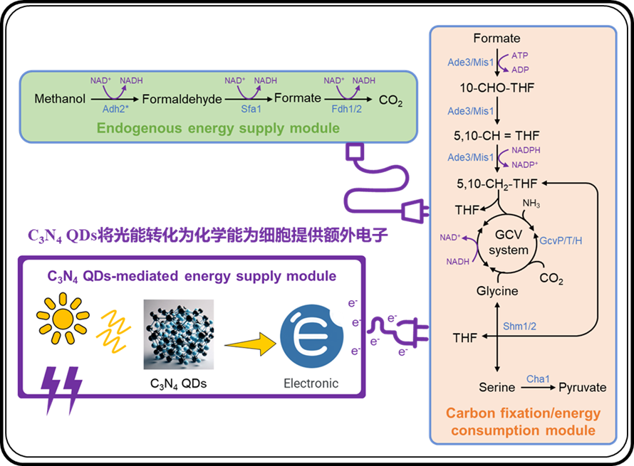 经典的代谢工程通常依赖理性设计,通过精确的基因改造来引入或优化代谢路径。然而,在应对复杂的代谢网络调控时,这一策略往往难以兼顾提高酶活性、回收中间代谢物、平衡辅因子与能量、调节基因表达以及中间代谢物解毒等诸多要求,而这些均是一碳化合物同化过程中公认的瓶颈。本项研究采用了合成染色体重排(SCRaMbLE)技术,结合实验室适应性进化(ALE)技术,通过自然选择过程,成功构建了能够以甲醇作为唯一碳源生长的酿酒酵母菌株,其倍增时间为58.18小时。对于进化菌株的多组学分析表明其通过一条此前未曾报道的Adh2-Sfa1-rGly(ASrG)途径,实现甲醇、甲酸与二氧化碳的共利用。对ASrG途径的进一步分析表明该途径通过甲醇的连续氧化提供能量。为此,研究团队引入了无机光催化材料C3N4量子点,为菌株的代谢过程提供额外的能量支持,成功将菌株的倍增时间缩短了14.5%至21.6%。此外,研究人员还发现丝氨酸在ASrG途径中起着关键作用,通过外源添加丝氨酸或调控相关基因的表达,可以进一步促进甲醇的同化。