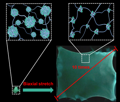 室温磷光(RTP)高分子水凝胶因其独特的光学性质,在柔性电子、生物成像、信息加密等领域具有巨大的应用潜力。然而,RTP材料对环境条件敏感,易受水分子和氧气的影响,导致三重态激子湮灭和严重的非辐射能量耗散。传统RTP高分子水凝胶通常采用聚合物基质刚性化(如结晶、取向等)的策略,在一定程度上防止发光团猝灭并且减少分子的热运动。然而,过度的结晶或取向会使得RTP水凝胶变脆,使得凝胶可能在裂纹等薄弱环节发生断裂,不利于RTP水凝胶的应用探索,尤其是在许多需要大变形的应用场景中。因此,赋予RTP水凝胶优异的单轴/双轴拉伸性能和抗撕裂性能对于拓展RTP水凝胶的应用范围具有重要意义。