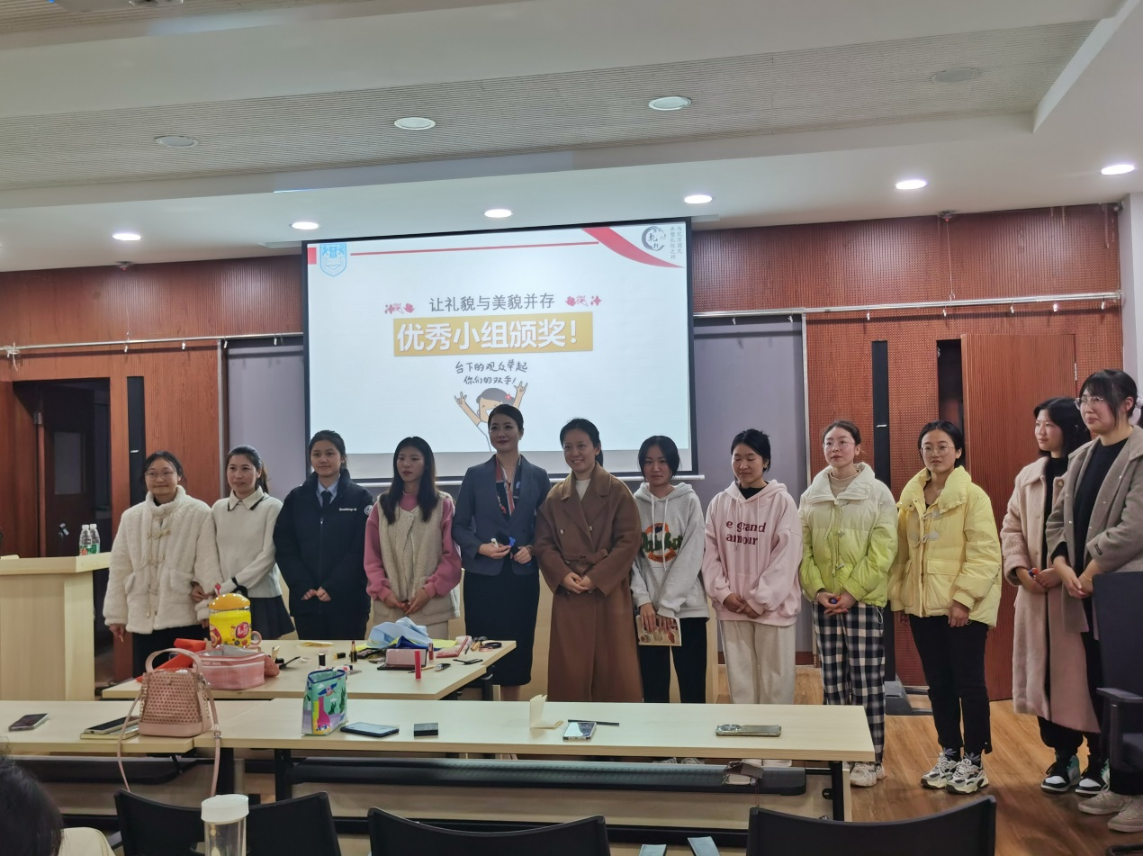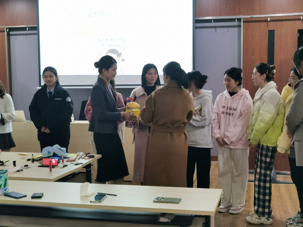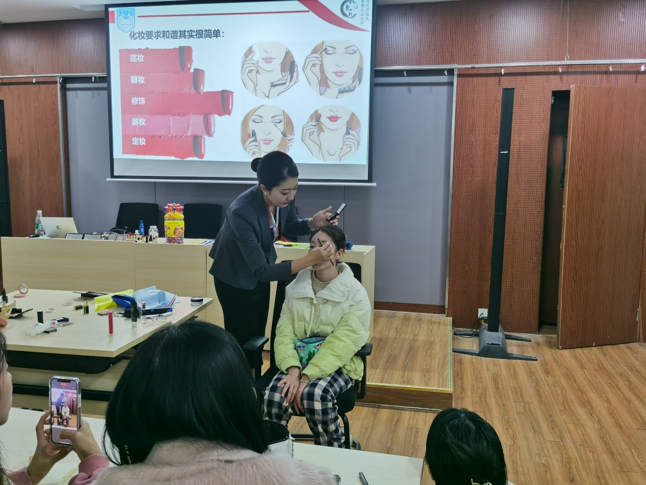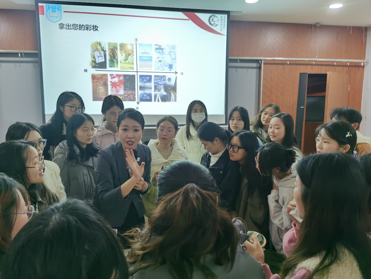 活动现场唐老师从日常的保养、化妆品的选择及职场妆容等方面,为同学们详细介绍了适合职场环境的妆容风格,并现场做了示范。本次活动还讲授了如何根据不同的场合选择合适的妆容,以及如何运用色彩搭配和造型技巧,塑造得体的形象,帮助大家更好地展现自己的个人魅力和专业能力,赢得他人的尊重与信任。最后,唐老师让同学们分小组在课堂上进行化妆比赛,然后进行专业指导和点评,通过同学与老师、同学与同学之间的交流互动及经验分享,加深了同学们对化妆技巧的理解和掌握。活动中采用积分制为同学们带来沉浸式体验。