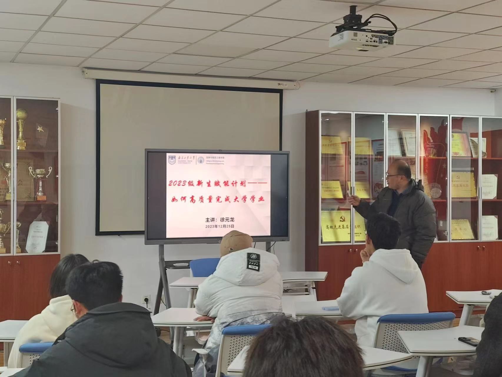 米老师结合自己读大学经历和新时期国家对高质量人才的需求,语重心长提醒同学们在大学不同时期要及时高质量完成目标任务。徐元龙副书记为我们展开了一场主题为"2023级新生赋能计划——如何高质量完成大学学业"的微讲座。他从学习态度、学习方法和自律习惯等方面为我们提供了宝贵的建议。他强调了大学建立自律意识和养成自律习惯的重要性,并向大家分享了保持自律的九条技巧技巧:有具体明确的目标、把挑战分解成小目标、把事情按优先级排序、排除干扰隔离手机、记录时间花在哪了、给自己即时的反馈、坚持锻炼身体、保持高质量睡眠、组队对抗惰性等。徐老师还结合制药2301的班规分析了班级建设的重点目标和举措,鼓励同学们发挥班级组织力量,互助帮扶携手共进,以班级命运共同体理念,以建设先进班级为目标,加强班级建设,并与各班级员工干部深入互动交流,强化了班级员工干部在班级建设中头雁作用。