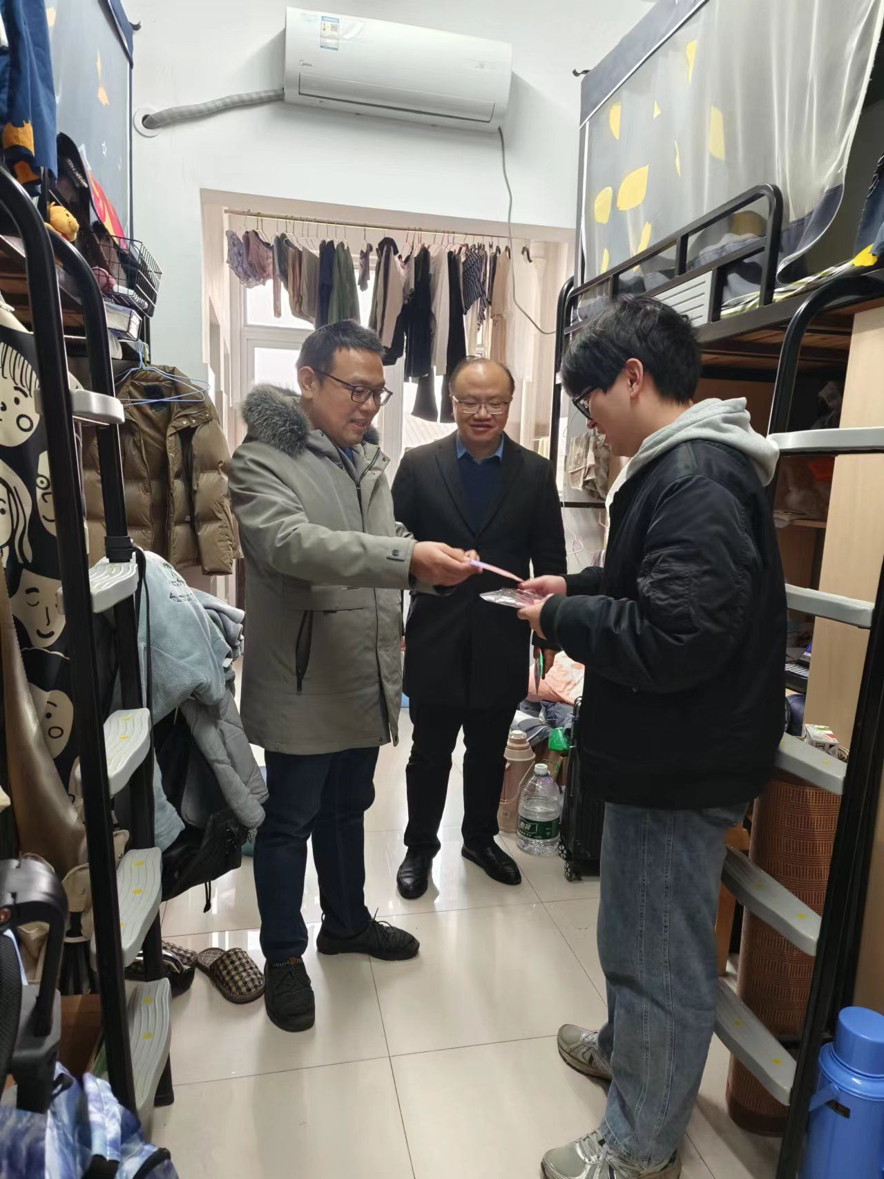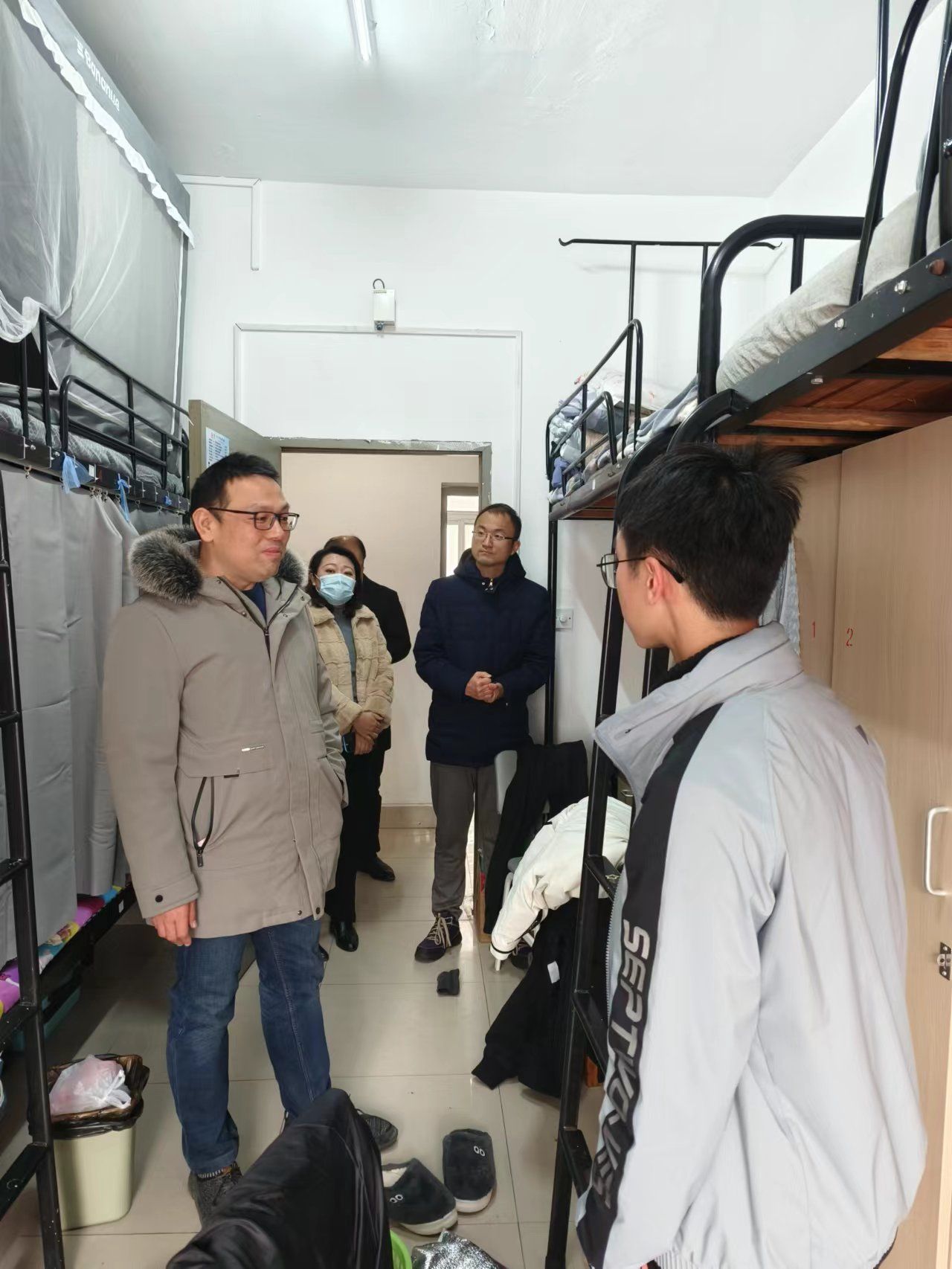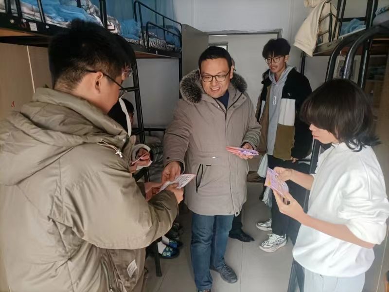 走访中,高振书记带领大家对员工宿舍进行全面安全隐患排查,就新生入学后的学习情况、寒假安排等与同学们深入交流,详细询问了大家在生活和其他方面是否存在困难,希望大家尽快完成身份转变,适应大学学习生活节奏,利用元旦假期做好计划安排,为大学首场期末考试充电蓄能。领导老师们分别走访23级新生和24届毕业班宿舍,亲切询问同学们“宿舍条件是否舒适”、“就业如何考虑”、“考研情况或期末周如何安排”等问题,深入了解员工生活和学习情况,叮嘱大家要加强身体锻炼,注意作息规律,最大可能减少不必要的熬夜,并对家庭经济困难同学送上慰问品。在慰问过程中,领导老师们仔细查看宿舍内务卫生,及时排查安全隐患,对个别问题现象进行现场整改。