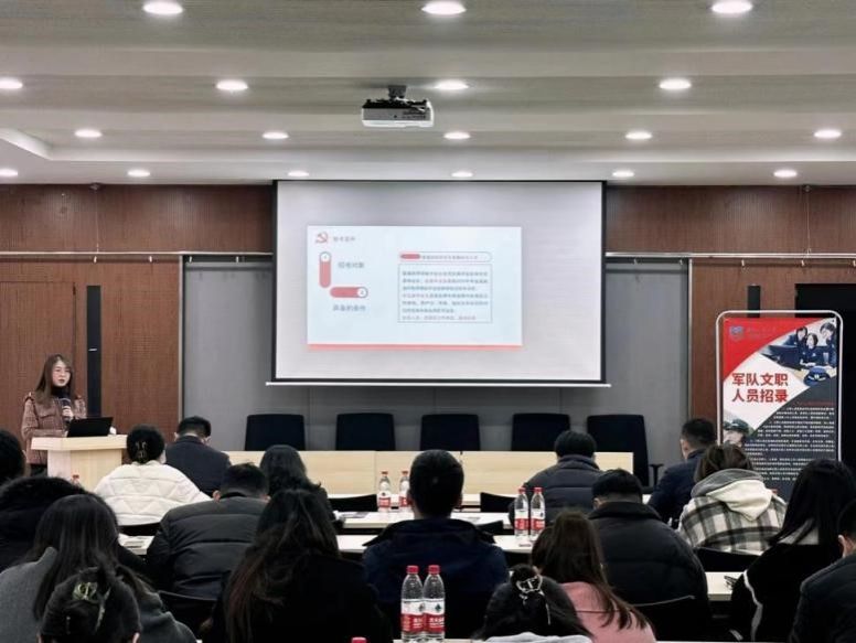 活动伊始,江苏军鸿教育周佳老师从军队文职的定义、报名条件、考情考务、文职管理岗岗位和技术岗岗位的福利待遇、就业分析以及公司各个专业选岗等方面进行详细介绍,并对军队文职考试的公共科目、专业科目,面试流程、选岗报名环节等结合案例进行阐述,并对比了当前军队文职的岗位缺口,希望全体毕业班辅导员老师做好就业育人工作,引导同学们增强国防意识,履行国防使命。