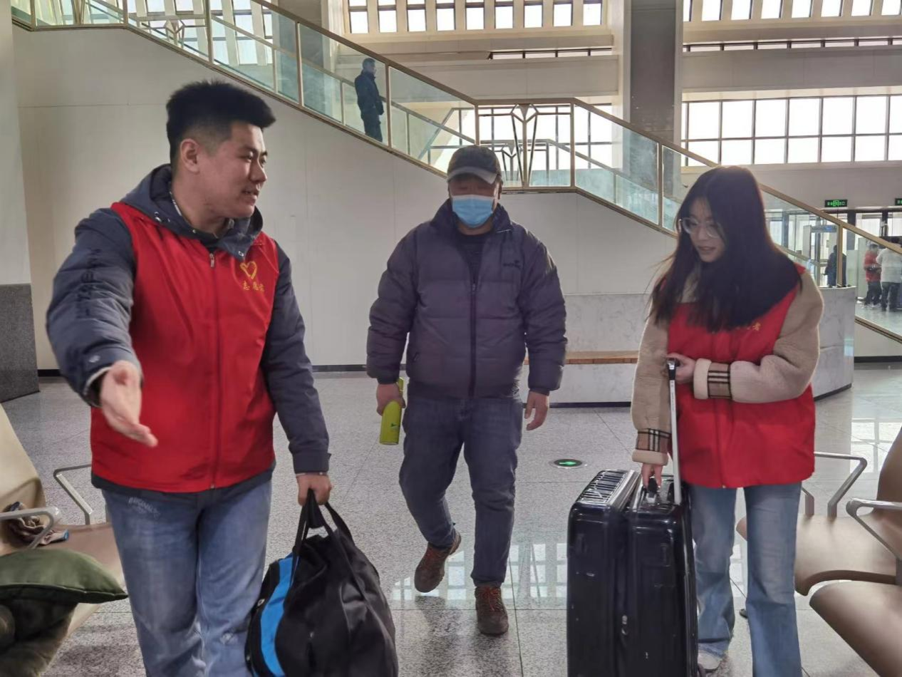 春运返乡,为保障游子归途顺利,生工2101班李福宸同学积极投入2024年东海县青年志愿服务春运“暖冬行动”,开展为期一个月(含春节)的志愿服务。进站口、安检区、候车厅都成为李福宸同学的工作场所,咨询指引、行李搬运、票务协助、引导乘车、普法教育、新春送福等每一件小事都让步履匆匆的返乡旅途充满温暖,李福宸同学也在志愿服务中收获感动,身着红马甲充分彰显青春本色。