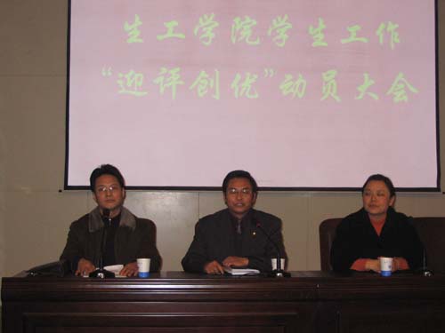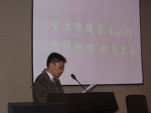 公司员工工作办公室主任郑万秋老师根据公司员工工作“迎评创优”动员大会的精神,对全院员工“迎评创优”工作提出了实施意见。生工0202班刘欣同学代表全院同学从6个方面表达了“迎评创优”的誓言。