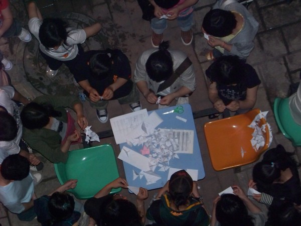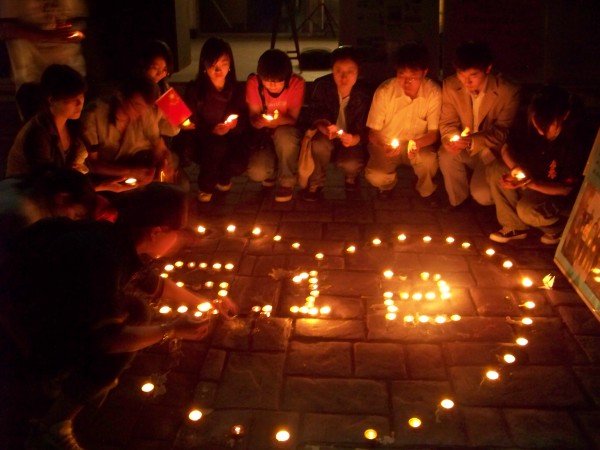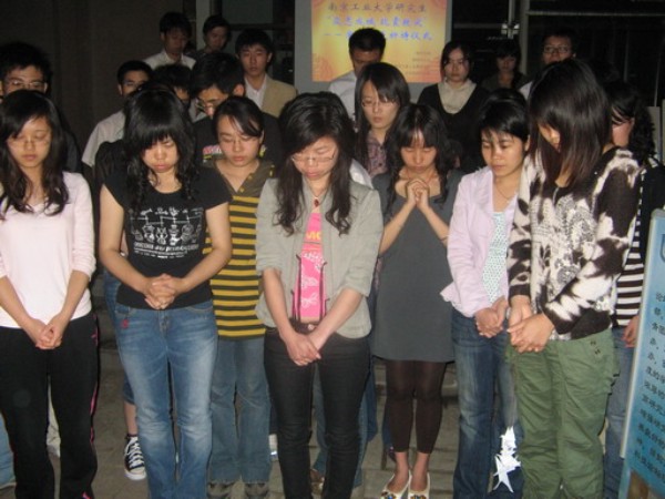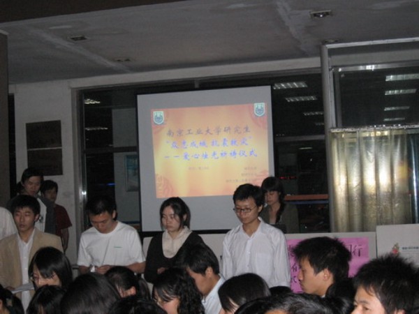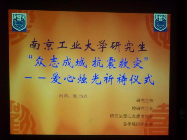 虽然远在震区外的我们不能亲临灾区救灾,但我们可以在心底默默地为他们祈福 !5月18日晚20:00,“爱心烛光祈祷仪式”在丁家桥校区新研楼下正式开始,来自四川绵阳的陈震,成都的李晴,重庆的李新华等同学作为四川籍在校研究生的代表,受邀来到现场。他们表示:身在异地,心系家乡,要与受灾的父老乡亲共同努力,渡过难关,加油,四川!加油,中国!伴随着《祈祷》阴郁而悲痛的旋律声,来自各个公司的研究生们及一些校教职工自觉的守护在心形烛光周围,为受灾的同胞祈福,为死难者默哀。心形烛光的中间是用蜡烛拼成的受难日期“5.12”醒目的数字,表示我们将永远牢记得这一天,记住灾难,记住全国上下众志成城的力量。另外,一串串千纸鹤寄托着我们无限的哀思,我们希望借此能为远方的灾民们送去我们最真挚的祝福。在短暂的祈福仪式之后我们摆放了一些灾区的图片,使同学们了解最新的救灾情况。看到那些感人的场景,有些同学不禁潸然泪下,纷纷自发的进行募捐活动。