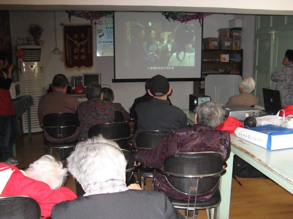 在上个月的活动(3月23日走进敬老院活动)中,志愿者们得知那里的老人们很喜欢看越剧,但是电视节目中观看越剧的机会不多,而且效果也不是很好,因此这次活动主要目的就是通过自带放映设备,为老人们放映越剧,丰富他们的文化生活,给他们带去欢乐和温暖。