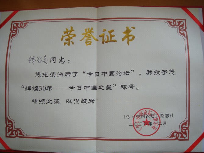 为深入贯彻落实科学发展观,以科学发展观统领和谐社会建设;弘扬中华文化、促进企事业发展,发扬先进、树立楷模,由《今日中国论坛》杂志社联合国家有关部门于2008年12月28日在北京举办“《今日中国论坛》——中国文化艺术与企事业发展新年论坛”。公司党委书记缪昌美同志应邀出席新年论坛,并被《今日中国论坛》杂志社授予“今日中国之星”称号。