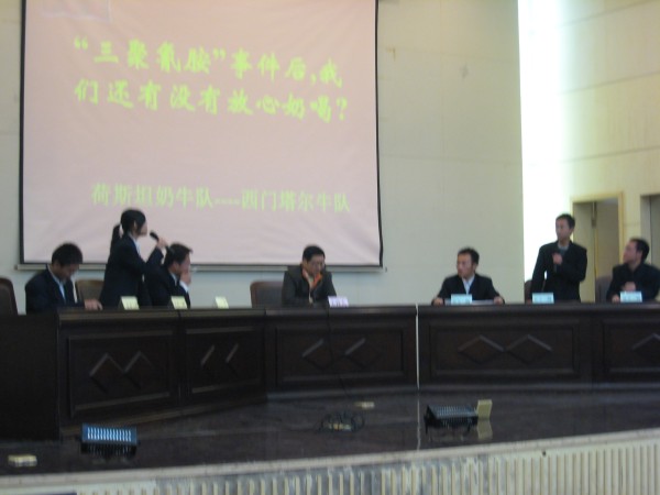 就当前出现的三聚氰胺事件,支部组织员工展开主题辩论——三聚氰胺事件以后,我们还有没有放心奶喝?正方:西门塔尔牛队,论点是“三聚氰胺事件以后,我们没有放心奶喝”;反方:荷斯坦奶牛队,论点是“三聚氰胺事件以后,我们有放心奶喝”。双方论辩精彩激烈,高潮此起彼伏,掌声接连不断。最终正方西门塔尔牛队因为立场明确、配合严密、辩驳有力获胜。熊晓辉教授做了点评:食品的质量是一个相对的概念,没有绝对安全的食品。辩论双方都能够主动思考,正方同学忧国忧民,反方同学充满自信,从大家身上我们看到了国家的未来,国家的希望。
