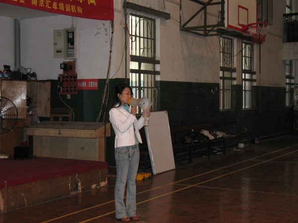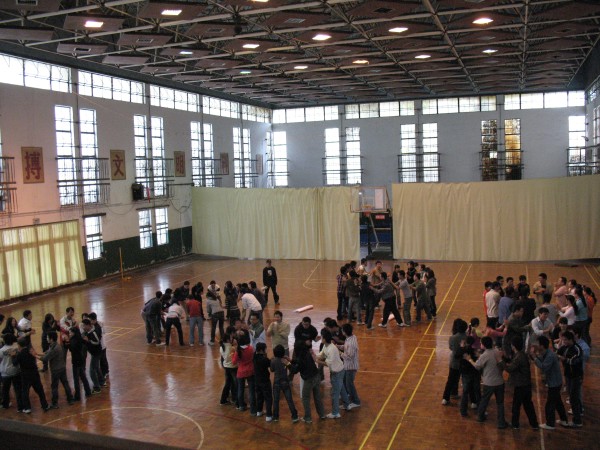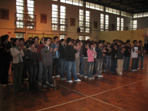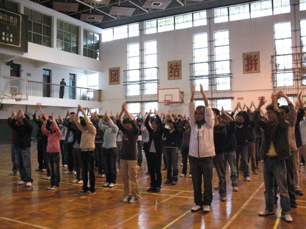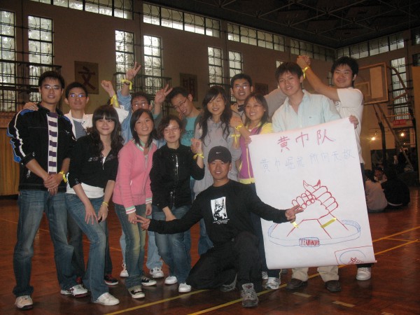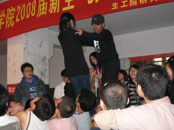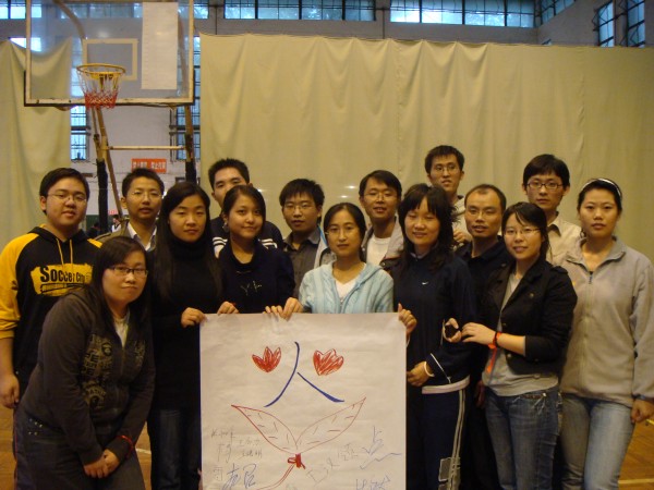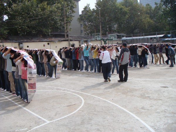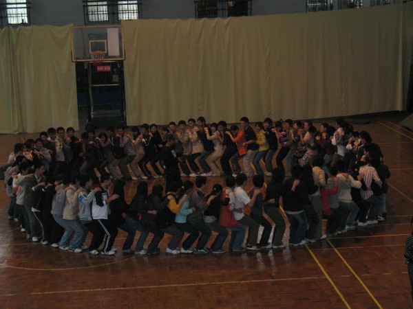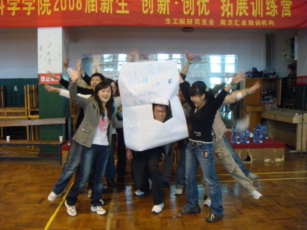 拓展训练在同学们的掌声和欢呼声中拉开帷幕。百名参训同学被分成若干个组,每组人数相当,称为一个团队。每一个团队,自行选出一名队长、一名副队长,并设计出自己的队名、队标、队歌和口号。经过无领导小组现场酝酿,形成了P King、黄巾队,火之队、狼队、小强队、十七狼等六支团队。然后以团队为单位,进行团队融冰、齐眉棍、车轮滚滚、信任背摔、驿站传书等活动。齐眉棍活动中,团队成员用手指托住一根细棍,将其放到地上,途中每个人的手都不能离开细棍,速度最快者胜出;车轮滚滚活动中,每队用报纸做成一个圈,大家排成一列站在圈里,一边用手在头顶传送报纸,一边一起前进;信任背摔活动中,由八名保护队员双手交叉成托盘,接住向后倒下的同学;驿站传书的活动中,同学们要遵守一定的规则,将信息传递。一个个精彩纷呈的活动,一次次将现场气氛推向高潮。