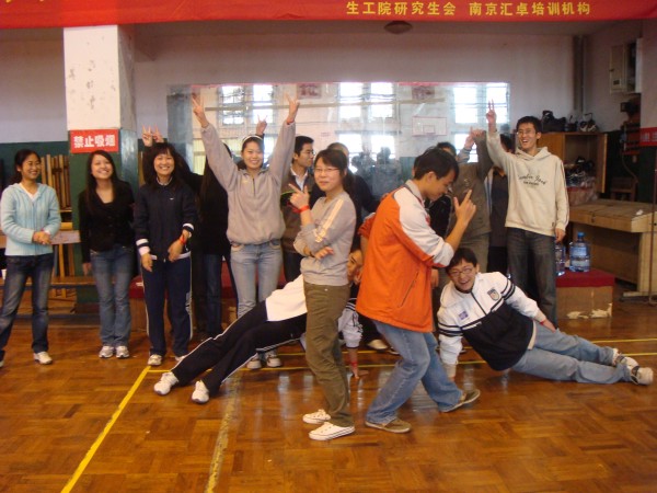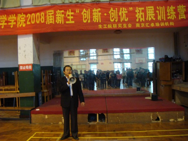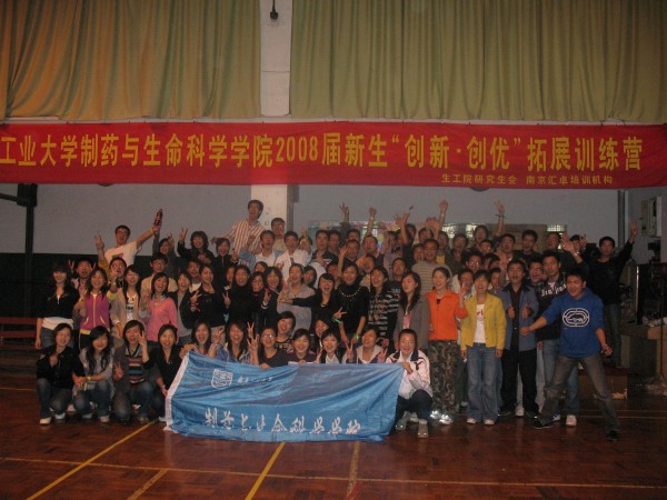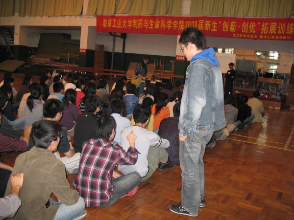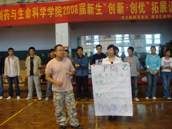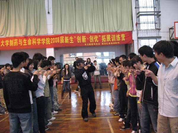 拓展奥运精神,打造“神七”团队;改善心智模式,励志创新创优。 2008年10月26日,制药与生命科学公司研究生会举办的2008级新生“创新创优”拓展训练营,在公司丁家桥校区体育馆及篮球场精彩举行。公司党委书记缪昌美老师在开营仪式上作动员讲话。他认为拓展训练拓展的就是团结奋进、勇于超越、追求卓越的精神。这种精神是我们努力学习的动力、战胜困难的决心、迎接成功的自信和拥抱明天的力量。他希望同学们在拓展训练中,把激情与朝气、智慧与风采、友谊与风格、活力与灵感更好地拓展出来。校研会主席朱骏同学应邀出席开营仪式并致辞喝彩鼓劲。
