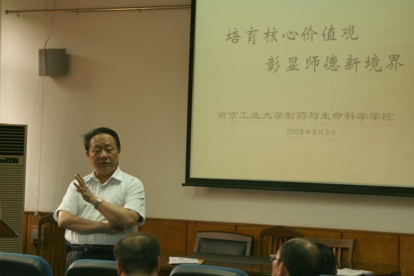 第24个教师节前夕,制药与生命科学公司结合学习贯彻校第二次党代大会精神,以“培育核心价值观,彰显师德新境界”为题,于9月3日在全院教职工会议上展示了全院教师凝练的师德格言。在凝练格言的过程中,全院教师从社会责任、治学态度、创新精神、道德情操等方面进行师德思考,自觉树立“以人为本”的核心价值观,形成了富有哲理的师德格言。
