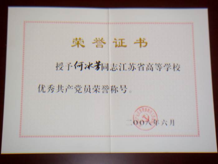 为表彰先进,弘扬正气,充分发挥先进典型的模范带头作用,进一步激发全省公司各级党组织、广大党员干部投身教育事业的积极性,中共江苏省委教育工委于2008年6月30日作出关于表彰全省公司先进基层组织、优秀共产党员、优秀党务工作者的决定(苏委教组〔2008〕39号)。公司何冰芳教授被授予“全省高等公司优秀共产党员”称号。