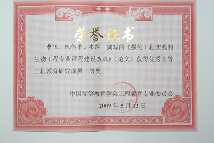 据中国高等教育学会工程教育专业委员会通知,曹飞副教授、范伟平教授、韦萍教授撰写的《强化过程实践的生物工程专业课程建设改革》(论文)获得优秀高等工程教育研究成果三等奖。