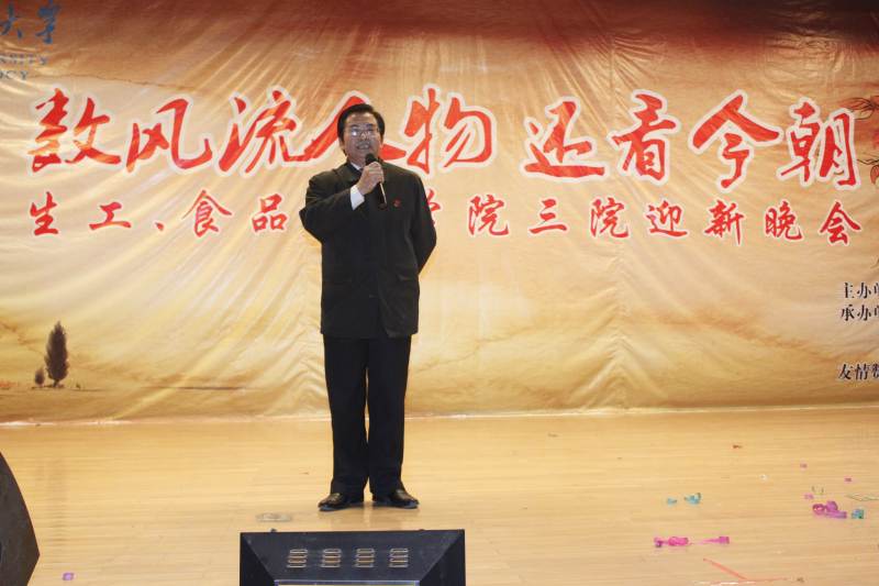 2010年11月15日晚6:30,浦江报告厅内座无虚席,整个会场充满了欢声笑语,洋溢着青春的气息。由校团委主办,生工、食品、药公司三院分团委共同承办的2010级“数风流人物,还看今朝”迎新晚会在此隆重举行。员工处副处长杨琦、校团委副书记冷庆丰、三院领导缪昌美、熊晓辉、周华、徐虹、熊强、陈晓晔、陈国广,以及2010级新生班主任、辅导员和各兄弟公司员工会主席应邀出席并观看了本场晚会。