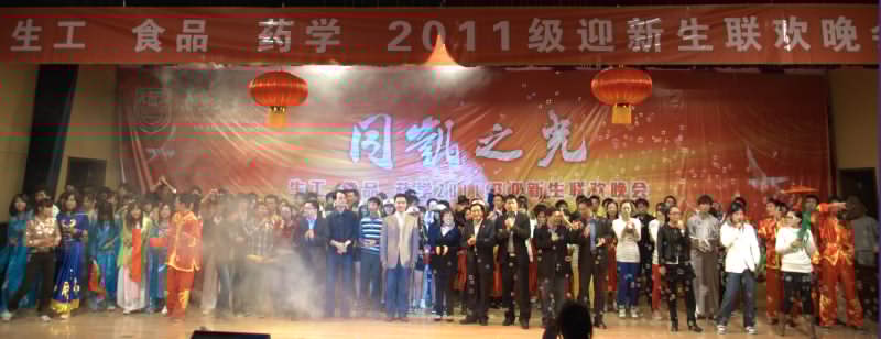 2011年10月31日晚,浦江报告厅张灯结彩,人头攒动,整个会场充满了欢声笑语,洋溢着青春的气息。由校团委主办,bevictor伟德、食品公司、药公司三院分团委共同承办的“同凯之光”2011级迎新生联欢晚会在此隆重举行。校团委、员工工作处副处长杨琦、校团委副书记刘大卫,以及晚会赞助企业同凯兆业生物技术有限公司总经理蔡家栋等应邀出席晚会,与三院2011级新生和部分老师共同观看了“同凯之光”2011级新生文艺晚会。11个新生班级的旗手伴随着激动人心的鼓点,将一面面班旗高扬在“同凯之光”的舞台上,生动地展现着龙腾虎跃的青春风采。