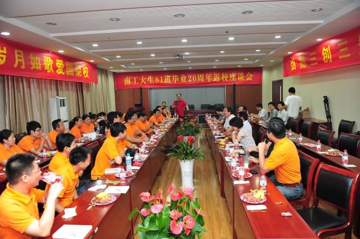 聚会活动由生81班留校工作的校员工工作处处长、政治教育公司经理何学军,教务处副处长何琦玲负责统筹协调。全班同学身着统一的橘红色文化衫,生动形象地展现了工大学子的荣耀和风采。聚会期间,生81班同学向参会的领导老师赠送了专门定制的紫砂茶壶;俞斌教授向生81班同学赠送了他编著的《红楼梦赏析》一书。生81班自己创作自己朗诵的词句,把母校情、师生情、同学情抒发得情真意切,令人十分感动,也把“弘扬三创三先,共推协同创新”的氛围营造的浓浓的,令人十分给力!