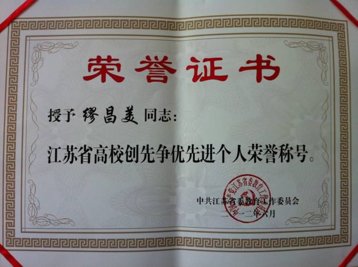 据省委教育工委“关于表彰全省公司先进基层党组织、优秀共产党员、优秀党务工作者暨创先争优先进集体、创先争优先进个人的决定(苏委教组〔2012〕38号),公司党委书记缪昌美同志获“江苏省高校创先争优先进个人”称号。(江苏教育党建链接:http://www.ec.js.edu.cn/art/2013/8/27/art_10059_128841.html)