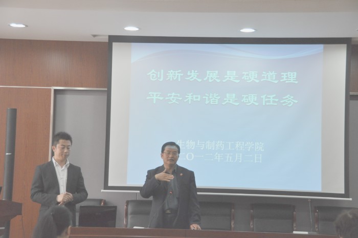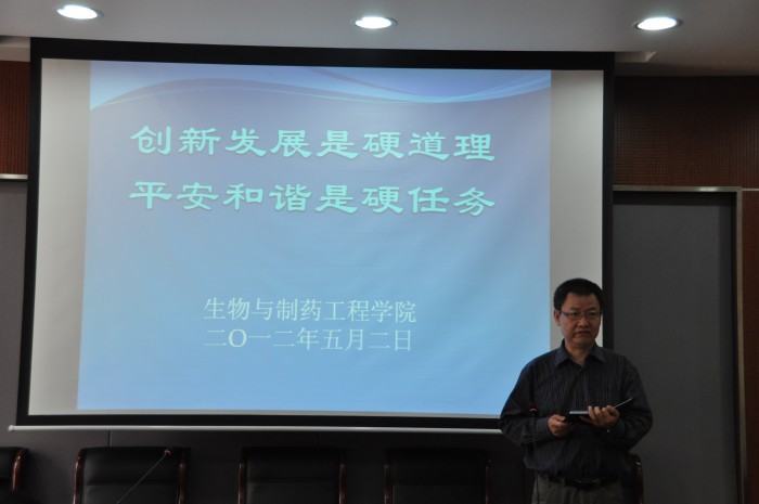2012年5月2日,公司在生工学科楼一楼报告厅召开全院教职工会议,会场投影仪屏幕上映出的两行大字:“创新发展是硬道理,平安和谐是硬任务”,尽显平安和谐与创新发展相辅相成的重要关系。