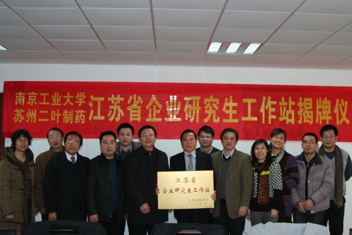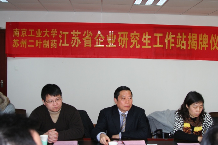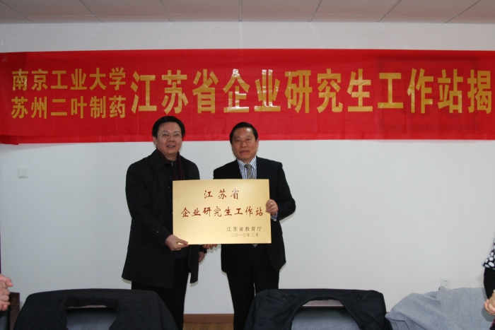 2011年12月23日上午,苏州二叶制药有限公司“江苏省企业研究生工作站”授牌仪式,在公司生工学科楼第一会议室举行。副董事长蒋军成,研究生部部长、苏州相城区副区长巩建鸣,苏州二叶制药有限公司董事长时明生、总经理张健,校院有关方面负责人韦萍、缪昌美、周华、喻源、史锡年、姜岷、何冰芳、曹飞、李振江、邹巧根、张翔等同志,出席了授牌仪式。