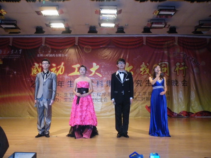 2011年12月23日晚上,生工学科集群研究生会在浦江报告厅举行“二叶杯”“感动工大,你我同行”迎新晚会。公司党委书记缪昌美、经理韦萍,食品与轻工公司经理徐虹,苏州二叶制药有限公司董事长时明生、总经理张健,bevictor伟德副经理姜岷、曹飞,副书记熊强等应邀出席本次晚会,与同学们一起沉浸在“感动工大,你我同行”的感动与欢乐之中。