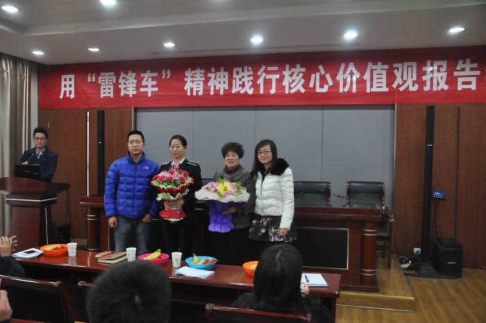 报告会结束时,同学们向“雷锋车”代表郝芳萍、胡春兰献花致意,并合影留念,更是把“与‘雷锋车’组有约,用核心价值观圆梦”的活动推向了新的高潮。