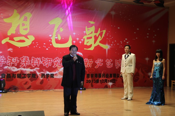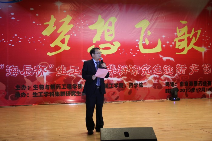 南京海辰药业股份有限公司董事长兼总经理曹于平先生,首先为“海辰杯”梦想飞歌研究生迎新文艺晚会致辞。他盛赞“海辰杯”梦想飞歌研究生迎新文艺晚会立意高雅,尽显生工学科集群研究生“梦想飞歌”的境界和责任、憧憬和期待。他以美好的心情与大家共同分享了南京海辰药业股份有限公司创建十年来取得的辉煌成就——作为专业从事医药研究、生产、销售的高科技民营制药企业,南京海辰药业股份有限公司座落在南京经济技术开发区、东临栖霞、南连钟山、北峙长江、环境优美,交通便利,一期工程占地108亩,总投资1.2亿元。拥有现代化的冻干粉针、头孢(分装)、固体制剂及原料药车间;拥有先进的生产设备和严格的质量管理体系;拥有卓越的经营团队和良好的发展势头。站在新的发展起点上,南京海辰药业股份有限公司将更加珍惜院企双方在产学研合作中建立的友谊,把协同创新不断提高到新的水平。他表示,从新的一年开始,南京海辰药业股份有限公司将面向生工学科集群研究生建立“海辰奖助学金”。他的致辞赢得了全场师生一阵阵欢快的掌声。
