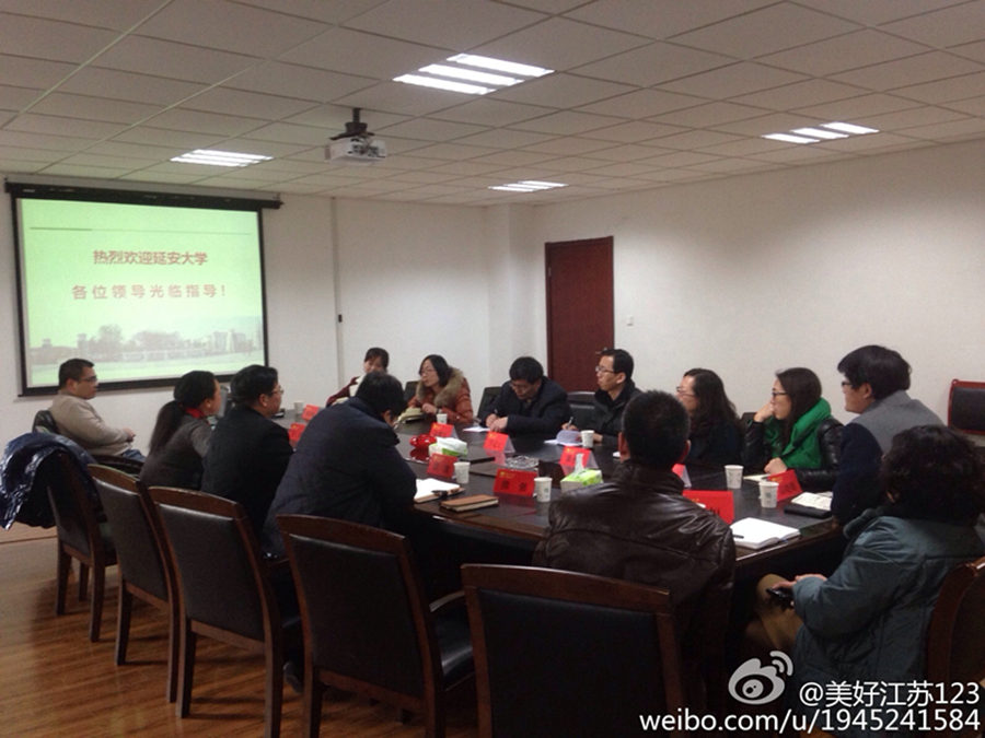 2015年元月19日下午,延安大学化学与化工公司经理高楼军教授一行,在延安大学客座教授、公司副经理郭凯教授的陪同下,对公司进行工作访问。公司韦萍、缪昌美、姜岷、熊强、李振江、胡南、贾红华、王浩绮、屠春燕等参加会谈,就公司产品、科学研究、文化传承创新等工作进行了双向交流。延安大学是由毛泽东同志亲自命名、中国共产党创办的第一所综合性大学。为表达对延安精神和延安客人特有的情怀,公司党委书记缪昌美同志特以“圣地延安照暖阳,优良作风美名扬;传承创新延大范,勇立潮头山水长”,与延安大学高楼军一行话别共勉!