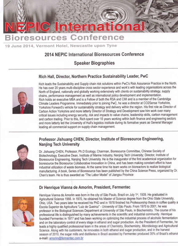 最近,2014年英国NEPIC国际生物资源会议(NEPIC International Bioresource Conference)在英国Newcastle举行。公司生物资源工程研究所所长、中国生物工程学会生物资源专业委员会主任陈集双教授,在江苏省科技创新协会和江苏省优势团队建设项目的支持下应邀参加。