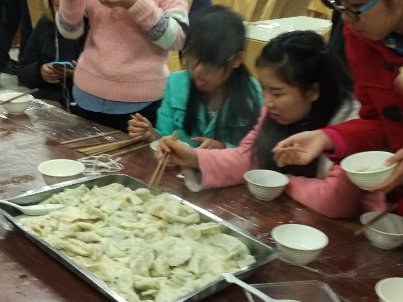 形状各异的饺子慢慢成型,活动气氛也达到了高潮。同学们往年在家里常看到父母包饺子,自己只是在旁边等饺子出锅,真正轮到自己上手才发现,还真不是易事——露馅的、破皮的……愉快的气氛很快感染整个餐厅,餐厅里洋溢着新年的味道。大家围坐在一起,吃着热气腾腾的饺子,享受着离家以来的第一顿新年团圆饭。