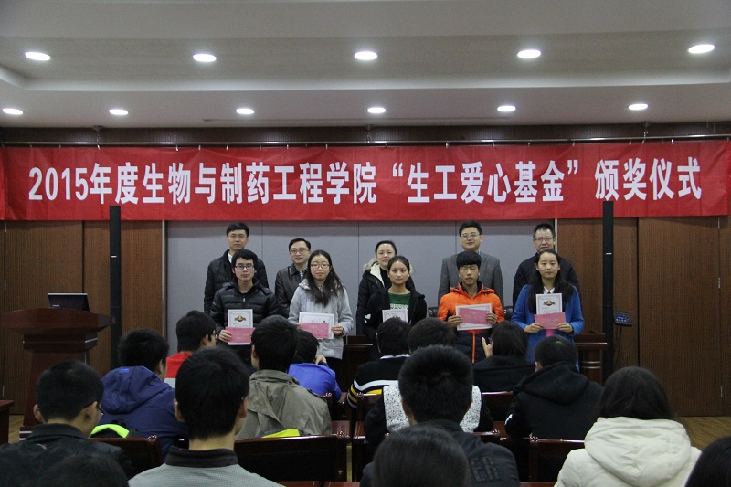 公司党委书记姜岷宣读了表彰决定,所有院领导为13位一等奖和52位二等奖获奖员工逐一颁发了证书和奖金。 “生工爱心基金”由公司教职员工捐资设立,其目的是帮助公司有困难的同学更好的完成学业,增强同学们的归属感和自信心,鼓励大家勤奋学习、追求梦想。基金面向公司在校全日制、没有违反校纪校规记录、没有受过任何处分、积极向上、身心健康的大一家庭经济困难本科生。制药1502班王改红作为获奖员工代表发言,表达了对公司的深深谢意和对未来的满满信心。