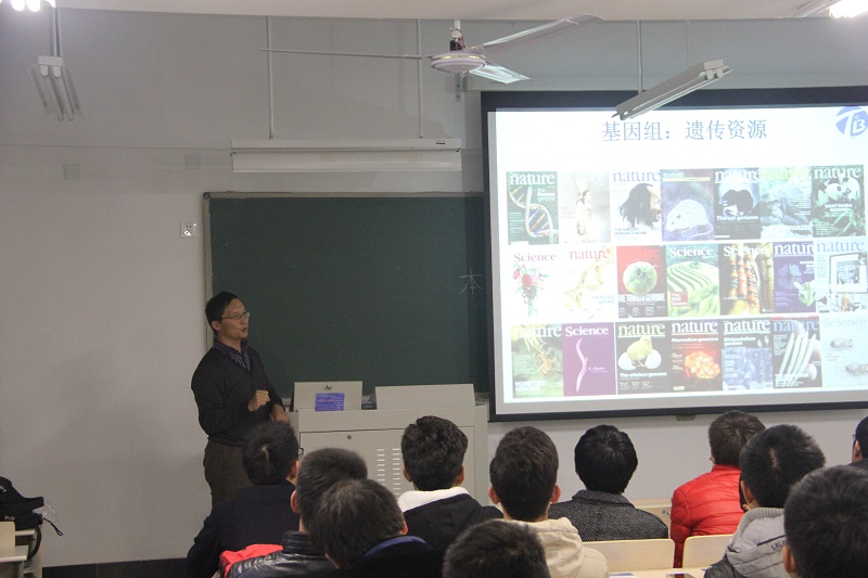 马红武研究员结合PPT演示,以生动的语言为同学们详细介绍了从基因组到代谢系统设计改造的生物资源利用,重点讲解了其课题组近年来围绕基于基因组的代谢网络构建和结构分析、基于代谢模型的途径设计和实验验证等方面的研究工作。马红武研究员指出生物质资源和由基因组决定的遗传资源是两种重要的生物资源,以生物质资源替代化石资源生产各种生物化学品和生物燃料是生物技术要实现的重要目标之一,而从生物资源到产品的转化则通过基因组编码的代谢网络实现,对细胞代谢网络进行重新设计改造以实现生物质资源的高效转化利用是合成生物学的重要目标。