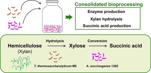 CBP(Consolidated bioprocessing,统合生物加工过程)被认为是一种能将木质纤维素转化为高附加值化学品的有效策略。微生物共培养体系可以通过劳动分工,同步完成纤维素酶/半纤维素酶分泌、纤维素/半纤维素水解和有用化学品合成等步骤,从而解决单菌代谢负荷重等问题。在CBP混菌体系中,还原糖的水解速率是限制木质纤维素生物转化的一个限速步骤。在本研究中,姜岷教授团队设计了一种概念验证的偏利共生的CBP双菌共培养体系,可实现直接利用木质纤维素合成琥珀酸。该共培养体系由高效分泌半纤维素酶的嗜热厌氧杆菌M5和合成琥珀酸的琥珀酸放线杆菌130Z组成。嗜热厌氧杆菌M5表达高活性半纤维素酶,可连续将木聚糖转化为木糖供产琥珀酸放线杆菌130Z转化利用;同时木糖的有效转化利用可解除水解底物对半纤维素酶的底物抑制作用。进一步对该CBP双菌体系发酵过程优化,可实现直接利用木聚糖生产32.50 g/L琥珀酸,收率达0.39 g/g;此外,该CBP双菌体系可直接降解80 g/L未处理的玉米芯生产12.51 g/L的丁二酸。这种偏利共生的CBP微生物共培养系统可应用于将木质纤维素生物质转化为其它高附加值化学品,为木质纤维素的一体化利用提供一条新的路径。