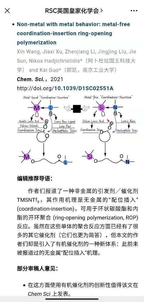 郭凯教授团队研究成果(Non-metal with metal behavior: metal-free coordination-insertion ring-opening polymerization(http://doi.org/10.1039/D1SC02551A))近日在RSC旗舰期刊𝑪𝒉𝒆𝒎𝒊𝒄𝒂𝒍 𝑺𝒄𝒊𝒆𝒏𝒄𝒆(2021年影响因子9.825,JCR分区:Q1)发表,并遴选为HOT Chemical Science articles 在RSC英国皇家化学会微信公众号(𝑪𝒉𝒆𝒎𝒊𝒄𝒂𝒍 𝑺𝒄𝒊𝒆𝒏𝒄𝒆 本周热文 | 2021 第二十六期 (qq.com))重点推介。
