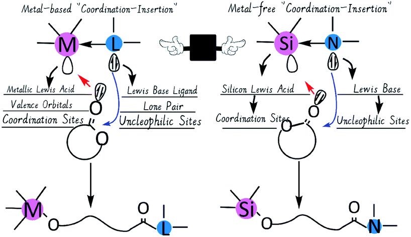 郭凯教授团队凝练近十年课题组在有机分子催化和生物基材料制备中的学术心得,平行于金属配合物“配合-插入”催化机理,创造性地提出以高价硅作为“类金属(metalloid)”元素以空d轨道与氧配位、氮原子以路易斯碱形式进攻碳基碳,首次实现双官能无金属“配位-插入”聚合(如下图示)。