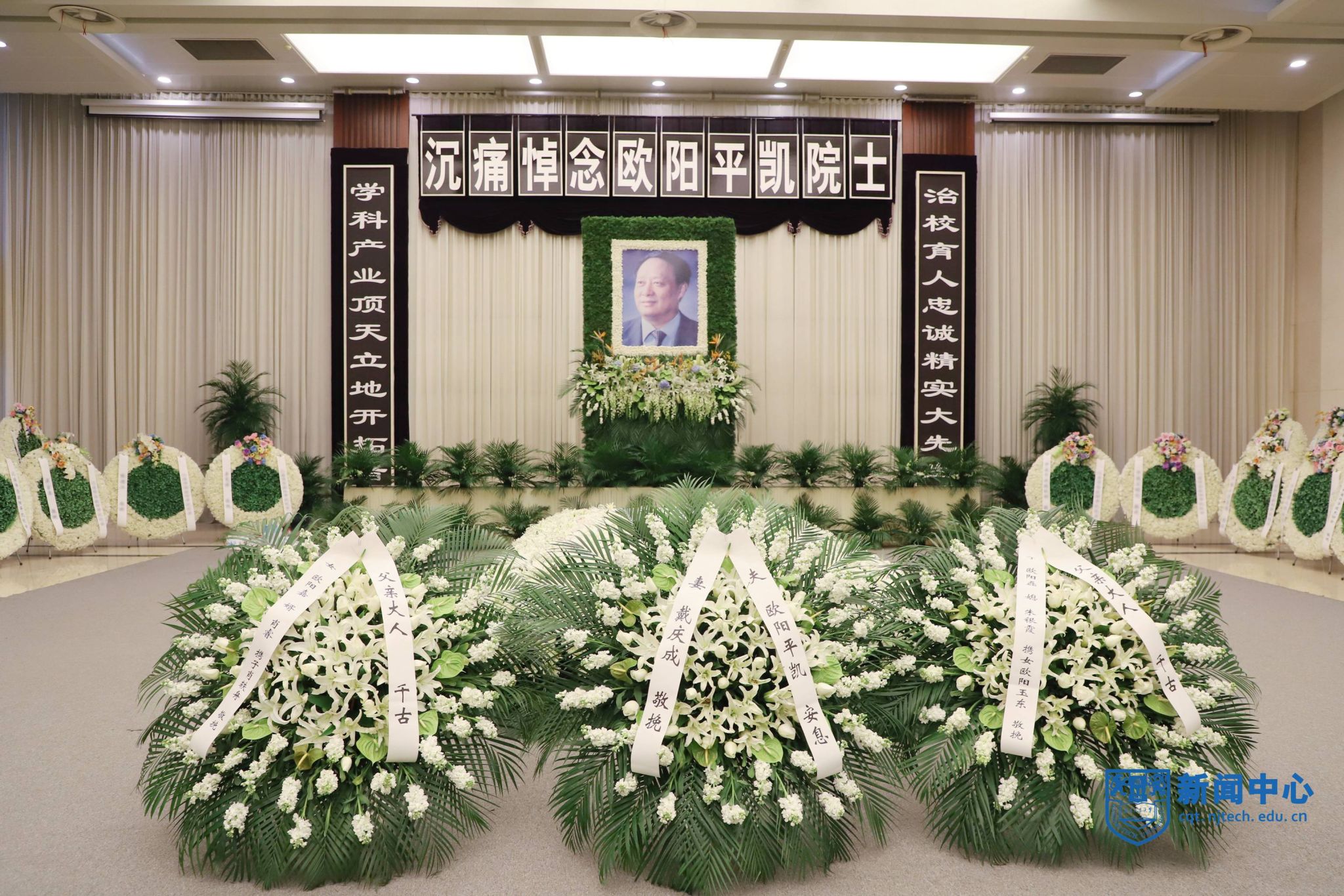 上午8时,博爱厅庄严肃穆、哀乐低回,参加送别的师生和社会各界人士胸佩白花进入会场,向欧阳平凯院士致以沉痛悼念和深切缅怀。博爱厅上方悬挂着黑底白字横幅,上面写着“沉痛悼念欧阳平凯院士”,横幅下方正中是欧阳平凯院士遗像,两侧悬挂挽联“治校育人忠诚精实大先生 学科产业顶天立地开拓者”。欧阳平凯院士遗体安卧在鲜花翠柏间,身上覆盖着中国共产党党旗。遗体前摆放着欧阳平凯院士夫人及子女后辈敬献的花篮,大厅两侧摆放着社会各界追悼的花圈。