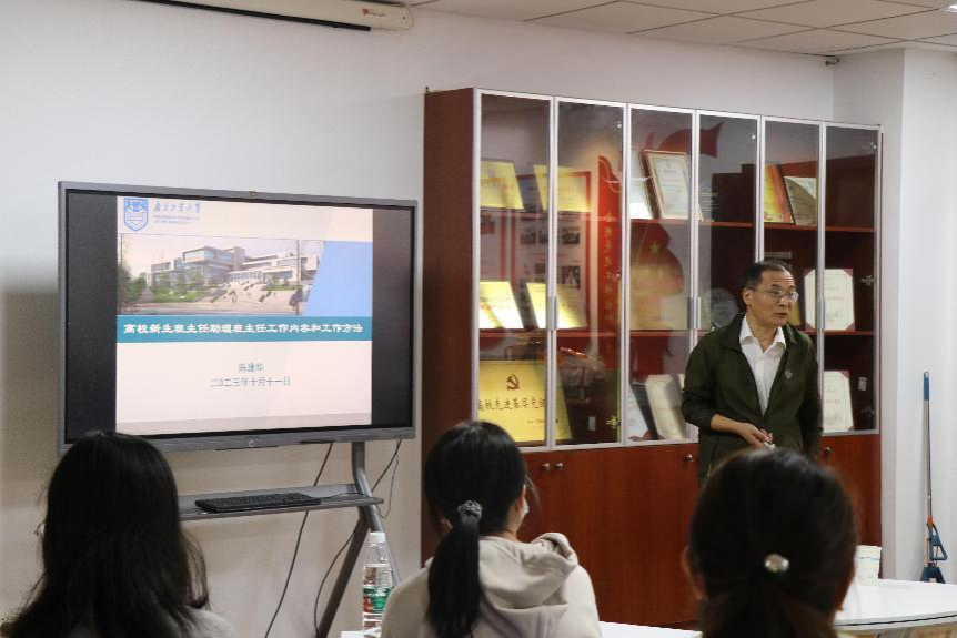 聘任仪式后,陈建华老师为新班主任以及助理班主任开展“师德师风建设”专题培训。陈老师首先强调设立新生班主任、助理班主任岗位的目标和意义,其次提醒在座师生要熟悉班主任、助理班主任的主要工作内容和基本要求,并指出班主任以及助理班主任应从员工的生活、学习、班级凝聚、人际交往和思想建设方面帮助新生。陈老师又结合自身多年员工工作经历,分享了班主任工作的方法与工作艺术,用“四心合一”为培训活动作出总结,即用心体验、细心观察、精心构思、潜心创作,培训现场氛围轻松愉悦。