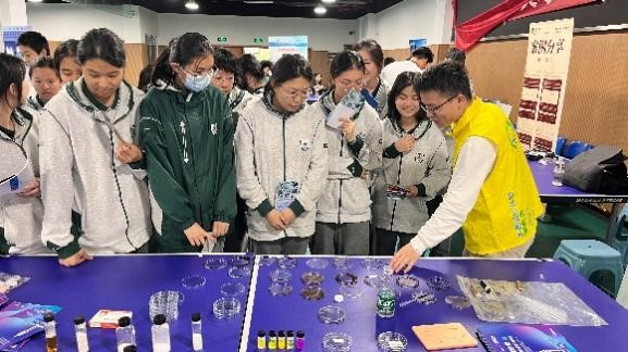 在活动现场,项目成员通过“公司学科发展”“欧阳平凯精神”“合成生物制造”三大主题的展板展示,彰显公司浓厚的科研氛围和强劲的学科实力。同时进行了合成生物学相关成果展示,用高值产物鼠李糖脂进行驱油小实验,让高中生们浸润体验公司浓厚的科创文化,为吸引潜在优质生源打下坚实基础。