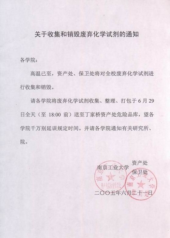 关于收集和销毁废弃化学试剂的通知