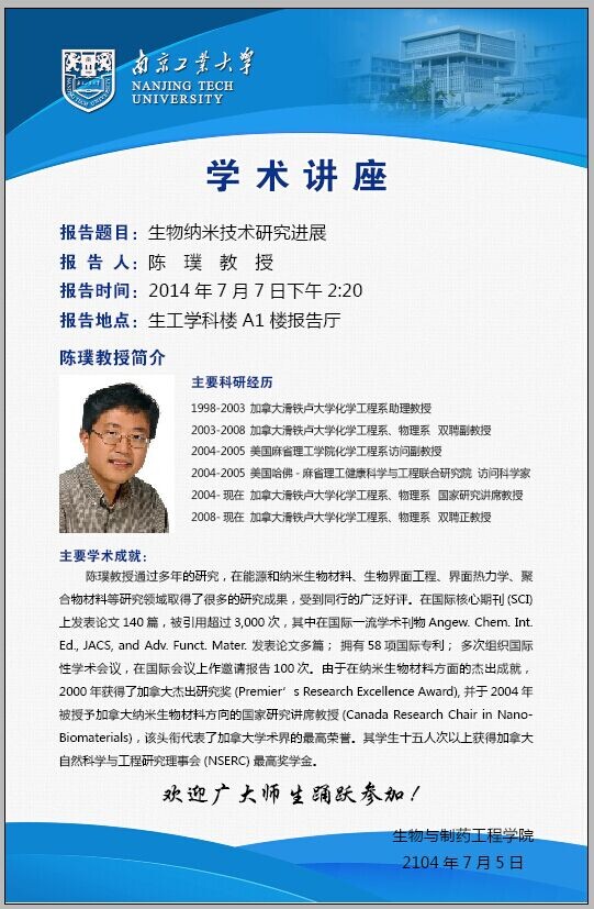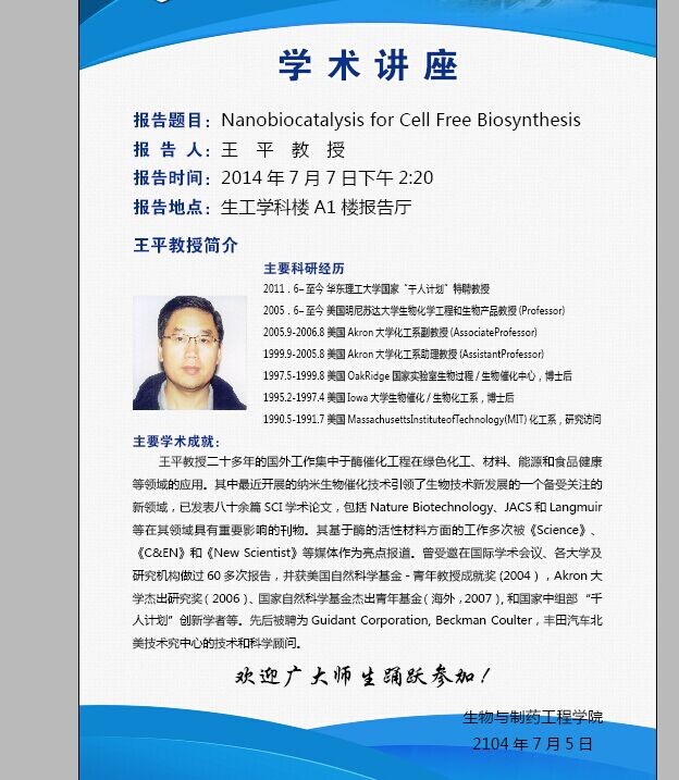 客座教授王平、陈璞先生学术报告会海报