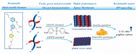 结合生物基环氧树脂的功能化开发已有研究基础,bevictor伟德K&k团队基于朴酚类化合物与5-羟甲基糠醛自主开发了新型生物基环氧单体结构,首次通过一锅法构建互穿聚合网络体系,并借助于聚合工艺优化实现互穿网络结构的调控,从而得到具有扭曲叠加和平面编织的微观结构。通过上述策略构建的环氧树脂材料,其储能模量可以高达5.04 GPa, 且工作温度范围可提高到230℃左右;该结构同时也赋予了材料较好的介电性能、抗形变性能以及阻燃性能等等。此外,针对新型结构进行碳化实验,选择性控制实现生物质碳资源的向生物质石墨烯结构的转化。相对于传统的石油基和已报到的生物基环氧树脂材料,该工作均显示出很好的技术优势。